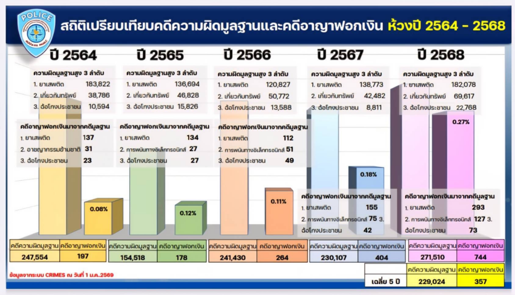 สถิติคดีความผิดมูลฐานและคดีอาญาฟอกเงินของ ศปปง.ตร. ในปี 2568 พบว่ามีการดำเนินการในความผิดมูลฐานสูง โดย 3 ลำดับแรก ได้แก่ คดียาเสพติด 182,078 คดี, คดีเกี่ยวกับทรัพย์ 69,617 คดี, คดีฉ้อโกงประชาชน 22,768 คดี นอกจากนี้ ดำเนินคดีอาญาฟอกเงินมาจากคดีมูลฐาน โดย 3 ลำดับแรก ได้แก่ ยาเสพติด 293 คดี, การพนันออนไลน์ 127 คดี, ฉ้อโกงประชาชน 73 คดี ในส่วนของการปฏิบัติการดำเนินคดีอาญาฟอกเงินของหน่วยต่างๆ ทั่วประเทศ รวม 744 คดี โดยมีผลการปฏิบัติคดีที่สำคัญที่น่าสนใจ ได้แก่ ปฏิบัติการ “ขยี้หัวใจทศกัณฐ์” เปิดโปงขบวนการจัดหาบัญชีม้า ตัดเส้นทางฟอกเงินธุรกิจสีเทา อายัดบัญชีธนาคารกว่า 800 บัญชี สามารถคืนเงินผู้เสียหาย ได้ถึง 33 ล้านบาท, ปฏิบัติการคดีเครือข่ายสแกมเมอร์ จับกุมผู้ต้องหาได้ 32 ราย ยึดทรัพย์สินมูลค่ากว่า 10,000 ล้านบาท