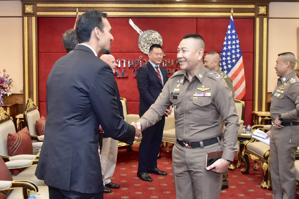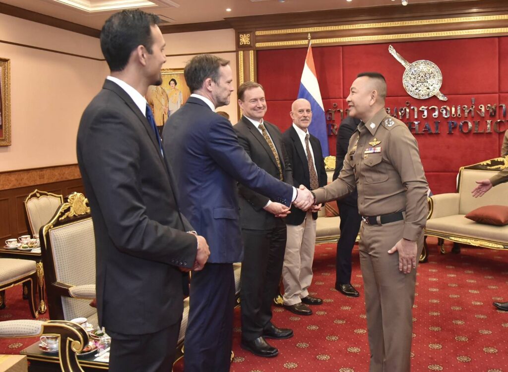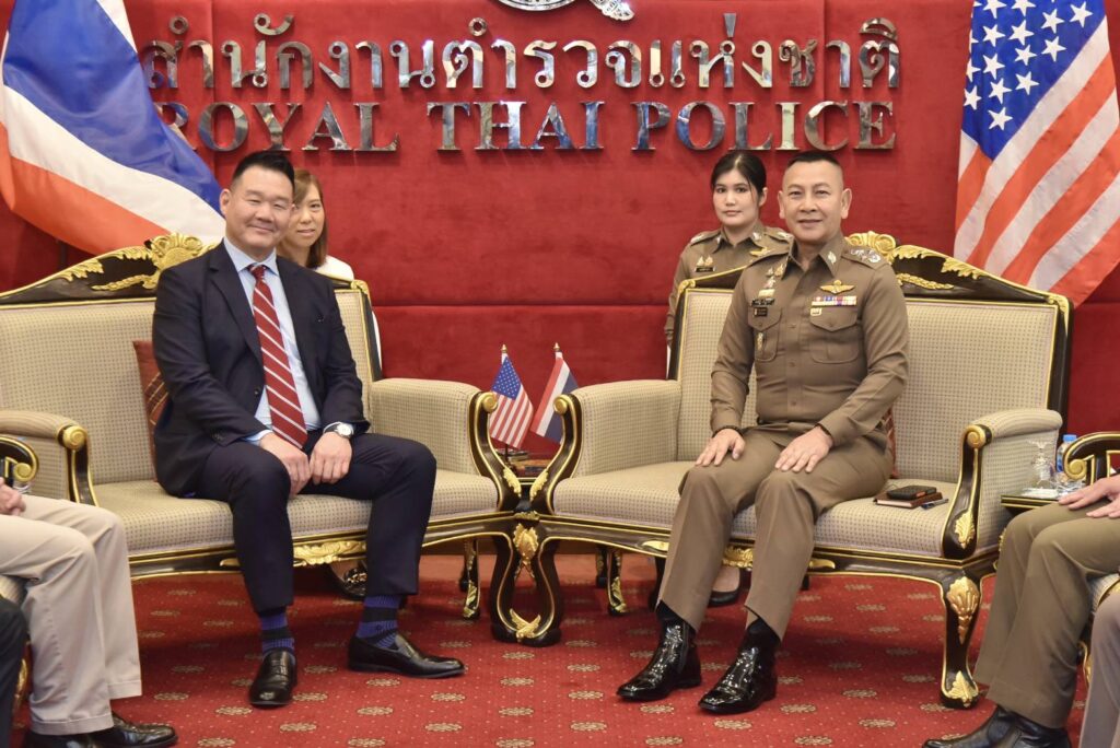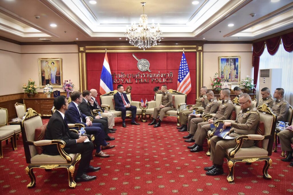 วันนี้(26 ม.ค.69) เวลา เวลา 11.30 น. พล.ต.อ.กิตติ์รัฐ พันธุ์เพ็ชร์ ผบ.ตร. ให้การต้อนรับ นายเจมส์ ซู (James Hsu) ผู้ช่วยผู้อำนวยการศูนย์ปฏิบัติการภูมิภาคเอเชียตะวันออกและแปซิฟิก (EAPMC) / กำกับดูแลสำนักงานที่ปรึกษาพิเศษ ประจำเอกอัครราชทูตสหรัฐอเมริกาประจำประเทศไทย และคณะฯ เพื่อเยี่ยมคารวะและหารือข้อราชการ โดยมี พล.ต.อ.ธัชชัย ปิตะนีละบุตร รอง ผบ.ตร. พล.ต.อ.สำราญ นวลมา รอง ผบ.ตร. และผู้มีส่วนเกี่ยวข้องร่วมให้การต้อนรับ ณ ห้องพรหมนอก ชั้น 2 อาคาร 1 สำนักงานตำรวจแห่งชาติ