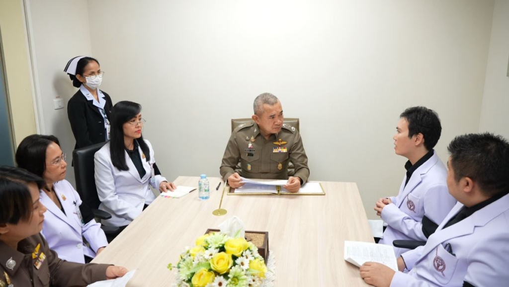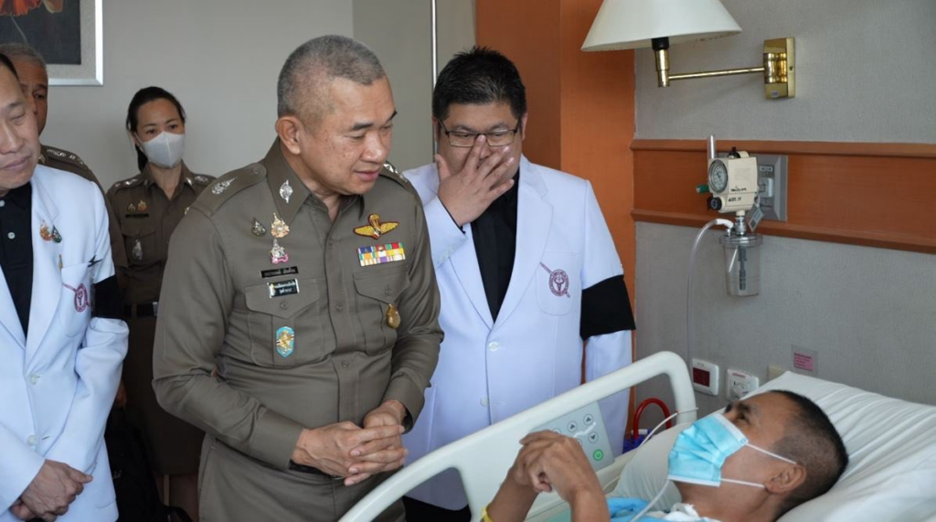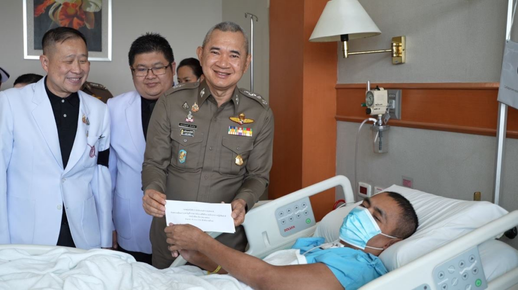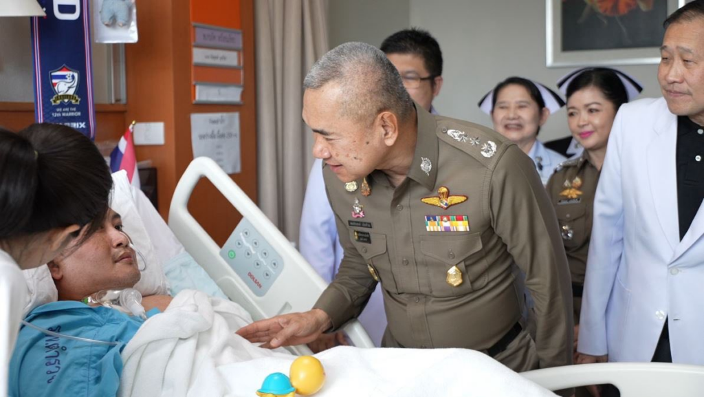 พร้อมมอบกระเช้าและเงินบำรุงขวัญแก่ข้าราชการตำรวจผู้กล้าหาญ ณ อาคารมหาภูมิพลราชานุสรณ์ 88 พรรษา ชั้น 11 โรงพยาบาลตำรวจ (รพ.ตร.) การตรวจเยี่ยมครั้งนี้เป็นการเน้นย้ำถึงความห่วงใยและให้ความสำคัญต่อสวัสดิการและความปลอดภัยของผู้ใต้บังคับบัญชาที่ปฏิบัติงานด้วยความเสี่ยงภัย เพื่อดูแลพี่น้องตำรวจให้ได้รับการรักษาพยาบาลที่ดีที่สุด และสร้างขวัญกำลังใจให้สามารถกลับมาปฏิบัติหน้าที่รับใช้ประชาชนได้อย่างเต็มภาคภูมิ