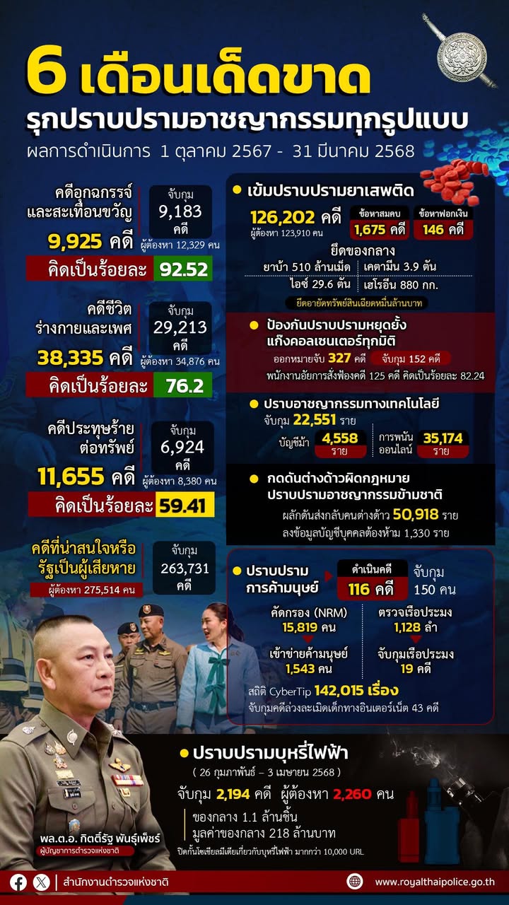 วันนี้ (23 เมษายน 2568) เวลา 10.30 น. พล.ต.อ.กิตติ์รัฐ พันธุ์เพ็ชร์ ผู้บัญชาการตำรวจแห่งชาติ มอบหมายให้ พล.ต.ท.อาชยน ไกรทอง โฆษกสำนักงานตำรวจแห่งชาติ พร้อมด้วย พล.ต.ต.ศิริวัฒน์ ดีพอ และ พล.ต.ต.วรศักดิ์ พิสิษฐบรรณกร รองโฆษกสำนักงานตำรวจแห่งชาติ แถลงผลการดำเนินการปราบปรามอาชญากรรมของสำนักงานตำรวจแห่งชาติ รอบ 6 เดือน ตั้งแต่วันที่ 1 ตุลาคม 2567 ถึง 31 มีนาคม 2568 ณ สารสิน อาคาร 1 สำนักงานตำรวจแห่งชาติ