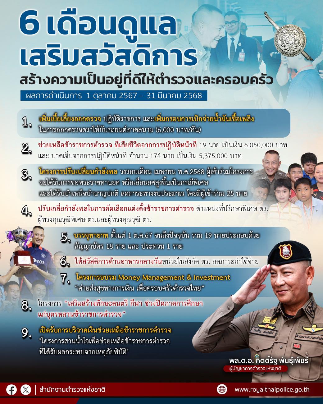นอกจากนี้ ผู้บัญชาการตำรวจแห่งชาติ ฝากเพิ่มเติมว่า ห้วงที่ผ่านมามีหลายเหตุการณ์ที่เกิดขึ้น บางคดีผู้เสียหายมีจำนวนมากที่จะต้องเข้าไปแก้ไขปัญหา เพิ่มจำนวนพนักงานสอบสวนหรือเจ้าหน้าที่ รวมถึงการบริหารจัดการคดีสำคัญ ช่วงการจัดงานเทศกาลสำคัญต่าง ๆ ที่ตำรวจได้เข้าไปปฏิบัติหน้าที่ จึงขอขอบคุณตำรวจทุกนายที่ได้ร่วมกันปฏิบัติหน้าที่ได้อย่างเห็นผลเป็นที่ประจักษ์ มีการขับเคลื่อนและเห็นผลเป็นที่ประจักษ์ แต่อย่างไรก็ตาม จะต้องขับเคลื่อนและกำหนดมาตรการเข้มข้น การปฏิบัติอย่างจริงจังต่อเนื่อง โดยเฉพาะอาชญากรรมที่ส่งผลกระทบต่อประชาชน ยาเสพติด อาชญากรรมออนไลน์ ปัญหาคนต่างด้าวผิดกฎหมาย/นอมินี จะต้องดำเนินการอย่างเด็ดขาด ต่อเนื่อง จริงจัง เพื่อให้อาชญากรรมดังกล่าวลดลง และแก้ไขปัญหาแบบยั่งยืน ในบางโครงการเป็นโครงการระยะยาว จะต้องเร่งรัดให้สำเร็จผลและปรับแผนการปราบปรามอาชญากรรมให้ทันต่อสภาพอาชญากรรม และการสร้างวินัยจราจร เพื่อลดอุบัติเหตุและ จะได้สรุปผลการดำเนินการในรายไตรมาสต่อไป