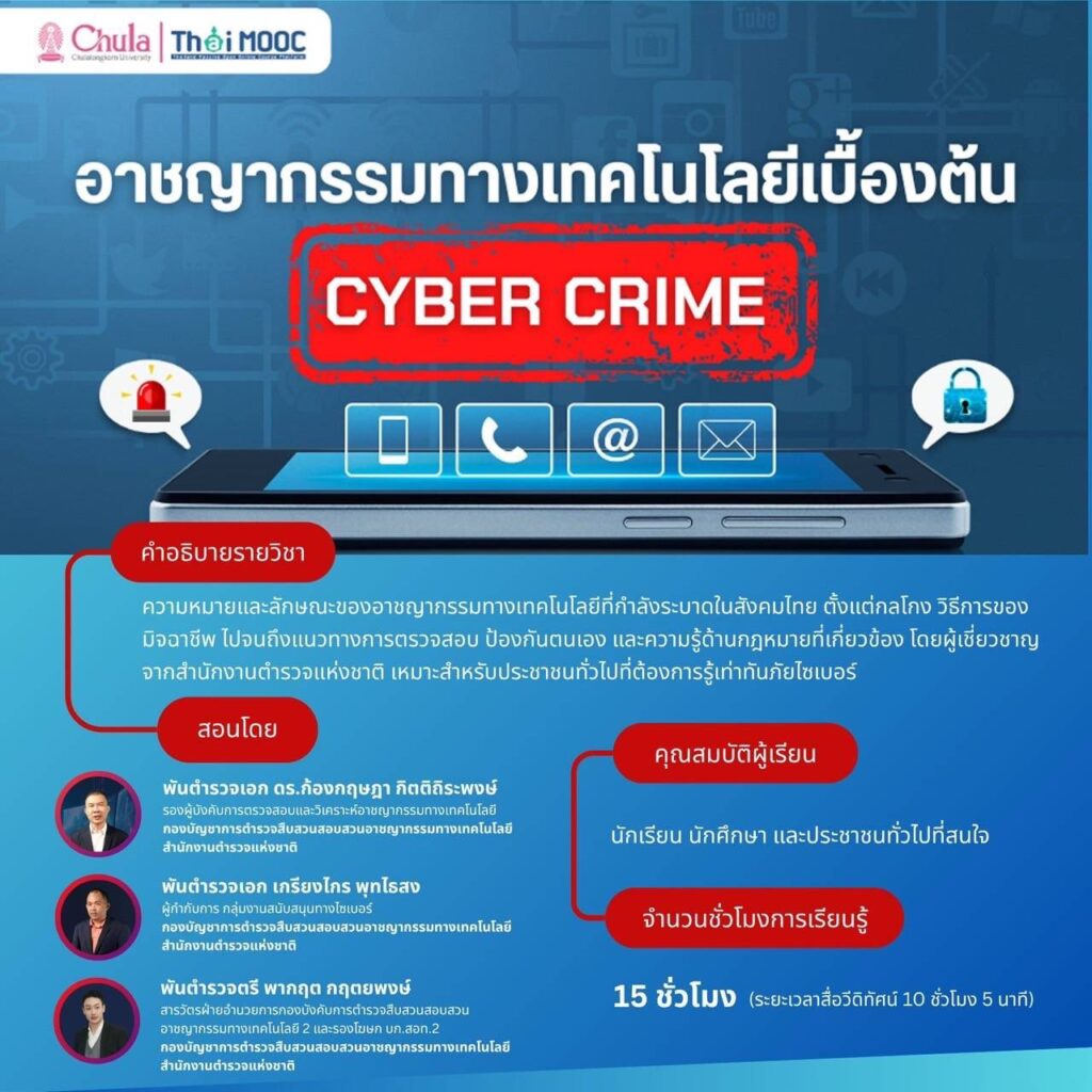 ไปเทียบโอนเป็นหน่วยกิตในการศึกษาต่อระดับอุดมศึกษาได้ รวมถึงประชาชนทั่วไปที่ต้องการเสริมสร้างภูมิคุ้มกันทางไซเบอร์ให้กับตนเองและครอบครัว สมัครเรียนฟรีผ่านระบบ Thai MOOC เว็บไซต์ https://thaimooc.ac.th คลิกเลือกหมวดหมู่รายวิชา “ทักษะชีวิตและการพัฒนาตนเอง” จากนั้นคลิกเลือกวิชา “อาชญากรรมทางเทคโนโลยีเบื้องต้น” หรือคลิกลิงก์ https://learn.thaimooc.ac.th/…/course-v1:CU+00868+0/about