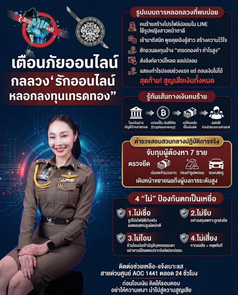 อินโฟกราฟฟิกเตือนภัยประชาชนสำนักงานตำรวจแห่งชาติ ขอแจ้งเตือน ระวังกลุ่มมิจฉาชีพใช้กลลวง “รักออนไลน์ ชวนลงทุน”admin07/12/2568
