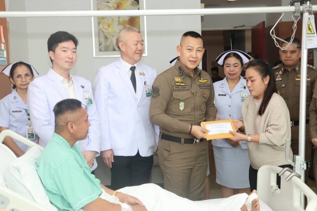 โอกาสนี้ ผบ.ตร.ได้พูดคุยสอบถามอาการและกล่าวให้กำลังใจแก่ ด.ต.จักรพันธ์ฯ และครอบครัว พร้อมทั้งมอบเงินช่วยเหลือและสิ่งของบำรุงขวัญ เพื่อเป็นขวัญและกำลังใจในการปฏิบัติหน้าที่เสียสละเพื่อประเทศชาติ ทั้งนี้ ผบ.ตร. ได้กำชับให้ทีมแพทย์และพยาบาลดูแลรักษาอาการอย่างใกล้ชิดและดีที่สุด พร้อมเน้นย้ำว่า สำนักงานตำรวจแห่งชาติจะดำเนินการดูแลเรื่องสิทธิประโยชน์และสวัสดิการต่างๆ อย่างดีที่สุด