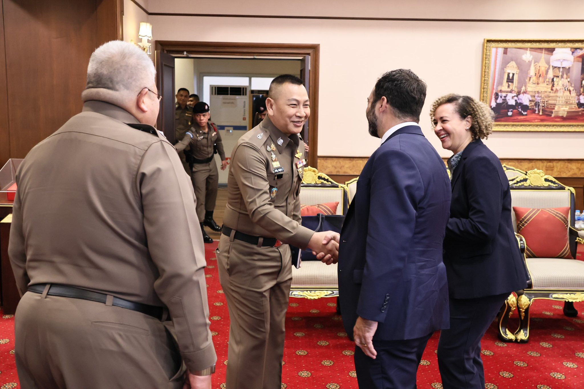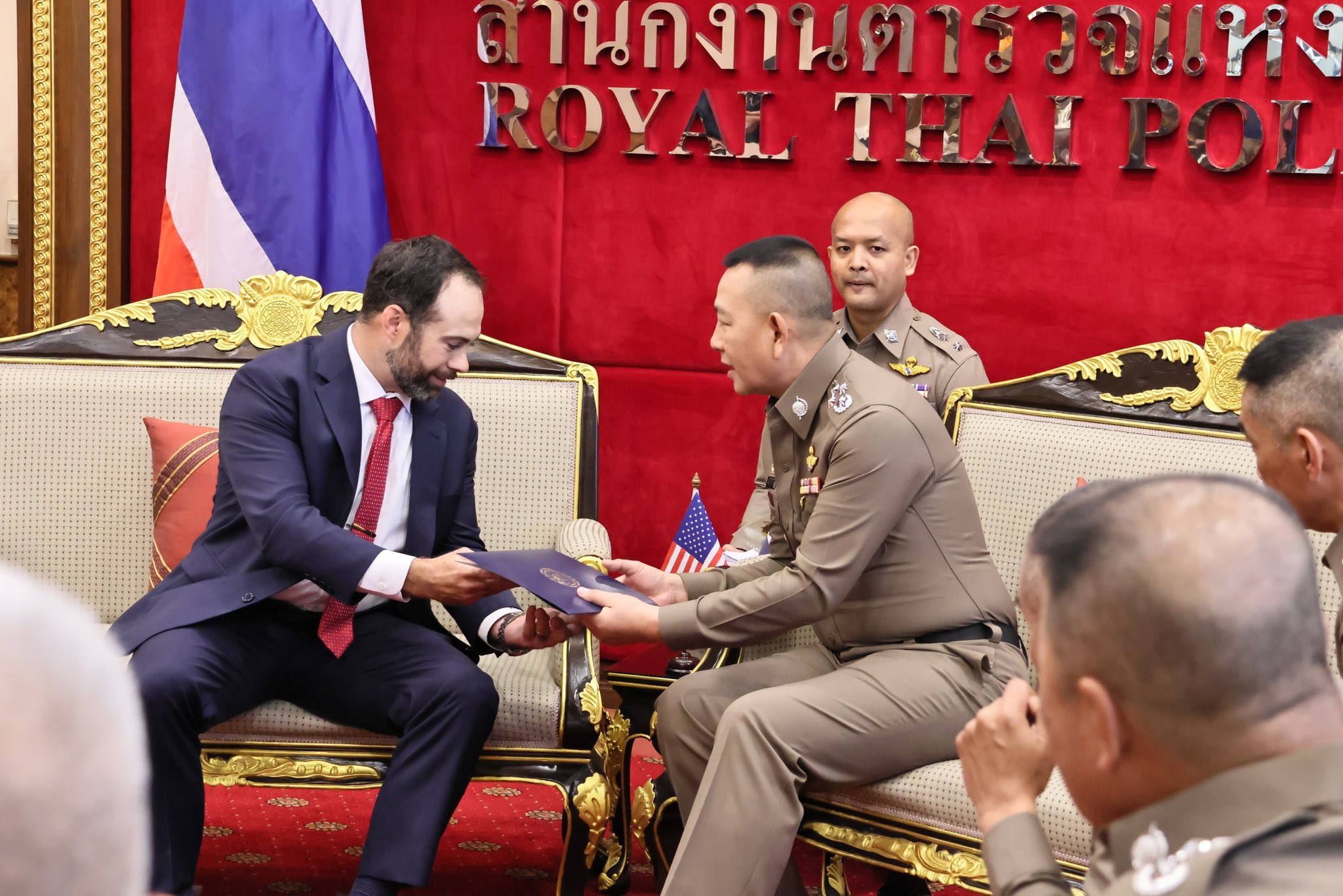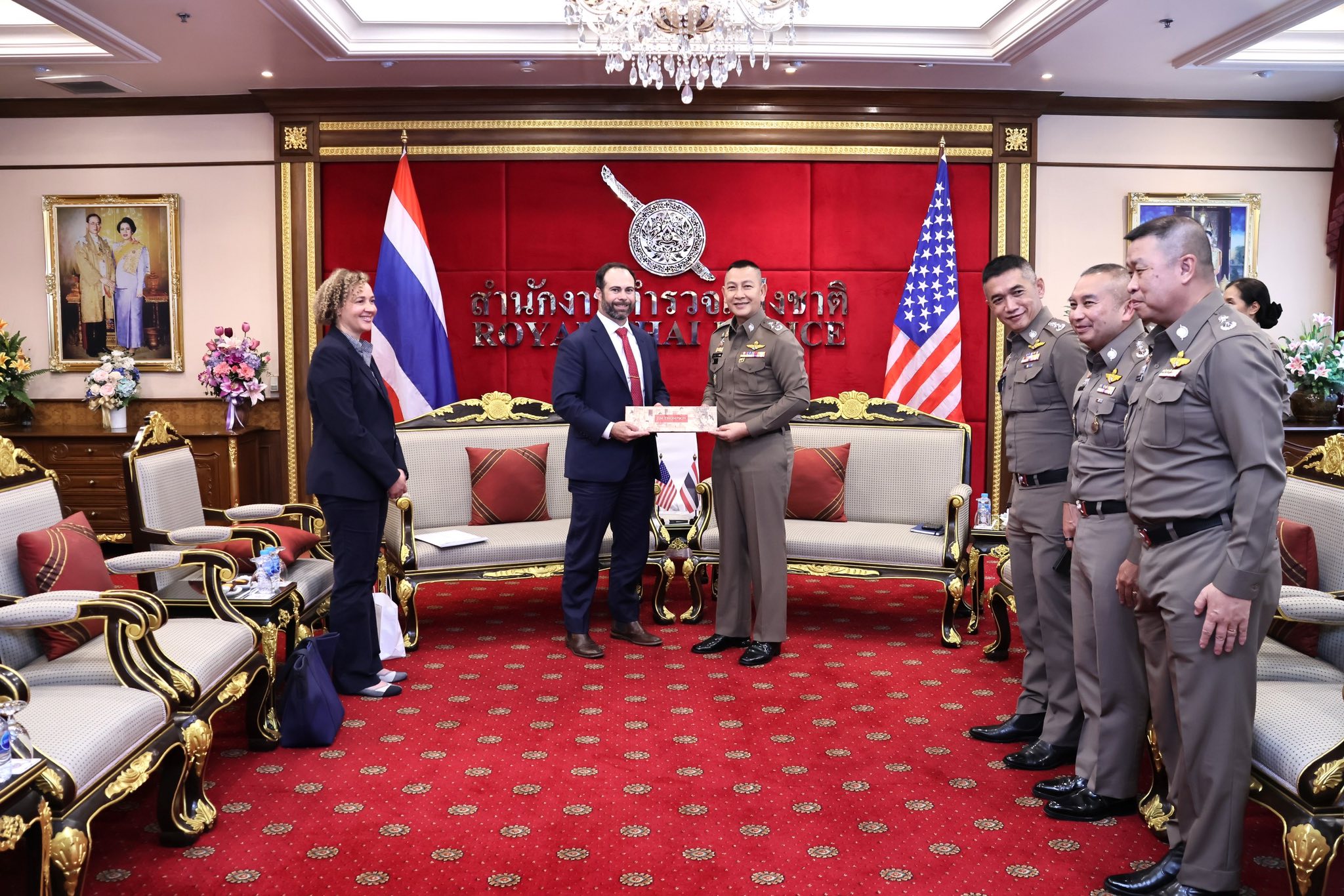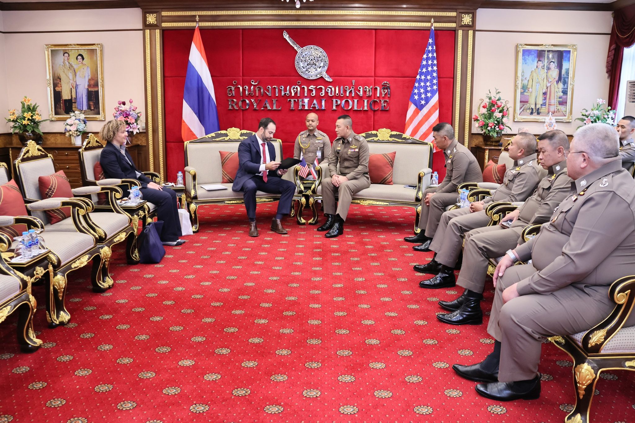 พล.ต.อ.กิตติ์รัฐ พันธุ์เพ็ชร์ ผู้บัญชาการตำรวจแห่งชาติ(ผบ.ตร.) ให้การต้อนรับ นายเบนจามิน เวอร์ชูว ผู้ช่วยทูตฝ่ายกฎหมาย สำนักงานตำรวจสืบสวนกลาง สหรัฐอเมริกา ประจำสถานเอกอัครทูตสหรัฐอเมริกาประจำประเทศไทย และนางทามาร่า แม็คเค็น รองผู้ช่วยทูตฝ่ายกฎหมายฯ ที่ขอเข้าพบเพื่อเยี่ยมคาราวะและหารือข้อราชการ โดยมี พล.ต.ท.กฤษฎา สุรพงษ์พงษ์ ผู้ช่วย ผบ.ตร.(กม 3) พล.ต.ท.อาชยน ไกรทอง ผบช.สกพ. พล.ต.ต.สุระพันธุ์ ไทยประเสริฐ ผบก.ตท. พร้อมผู้มีส่วนเกี่ยวข้องร่วมให้การต้อนรับ ณ ห้องพรหมนอก ชั้น 2 อาคาร 1 ตร.