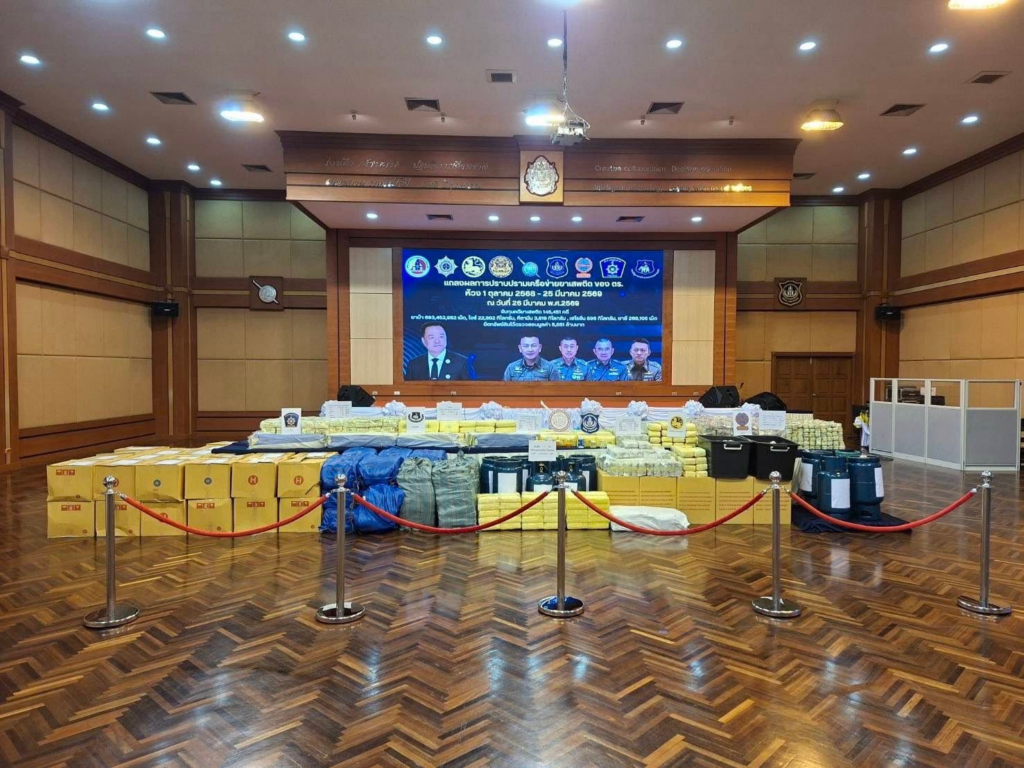 วันนี้ (26 มีนาคม 2569) เวลา 14.00 น. พล.ต.อ.กิตติ์รัฐ พันธุ์เพ็ชร์ ผู้บัญชาการตำรวจแห่งชาติ (ผบ.ตร.) เป็นประธานการแถลงผลการปฏิบัติปราบปรามเครือข่ายยาเสพติดของสำนักงานตำรวจแห่งชาติ (ห้วงวันที่ 1 ตุลาคม 2568 – 25 มีนาคม 2569) ที่กองบัญชาการตำรวจปราบปรามยาเสพติด (บช.ปส.) โดยมี พล.ต.อ.สำราญ นวลมา รอง ผบ.ตร./ผอ.ศอ.ปส.ตร., พล.ต.ท.อาชยน ไกรทอง ผบช.ปส., พล.ต.ท.สยาม บุญสม ผบช.น., พล.ต.ท.กฤตธาพล ยี่สาคร ผบช.ภ.5, พล.ต.ต.ธีรเดช ธรรมสุธีร์ รอง ผบช.น./รอง โฆษก ตร., ผู้แทน บช.ตชด., ผู้แทน สำนักงาน ป.ป.ส. และ ผู้แทน กอ.รมน. โดยบูรณาการทุกหน่วยที่เกี่ยวข้อง เพื่อ “ตัดต้นทาง–ตัดเส้นทาง–ตัดปลายทาง” พร้อมยึดทรัพย์เครือข่ายผู้กระทำผิดอย่างเป็นรูปธรรม