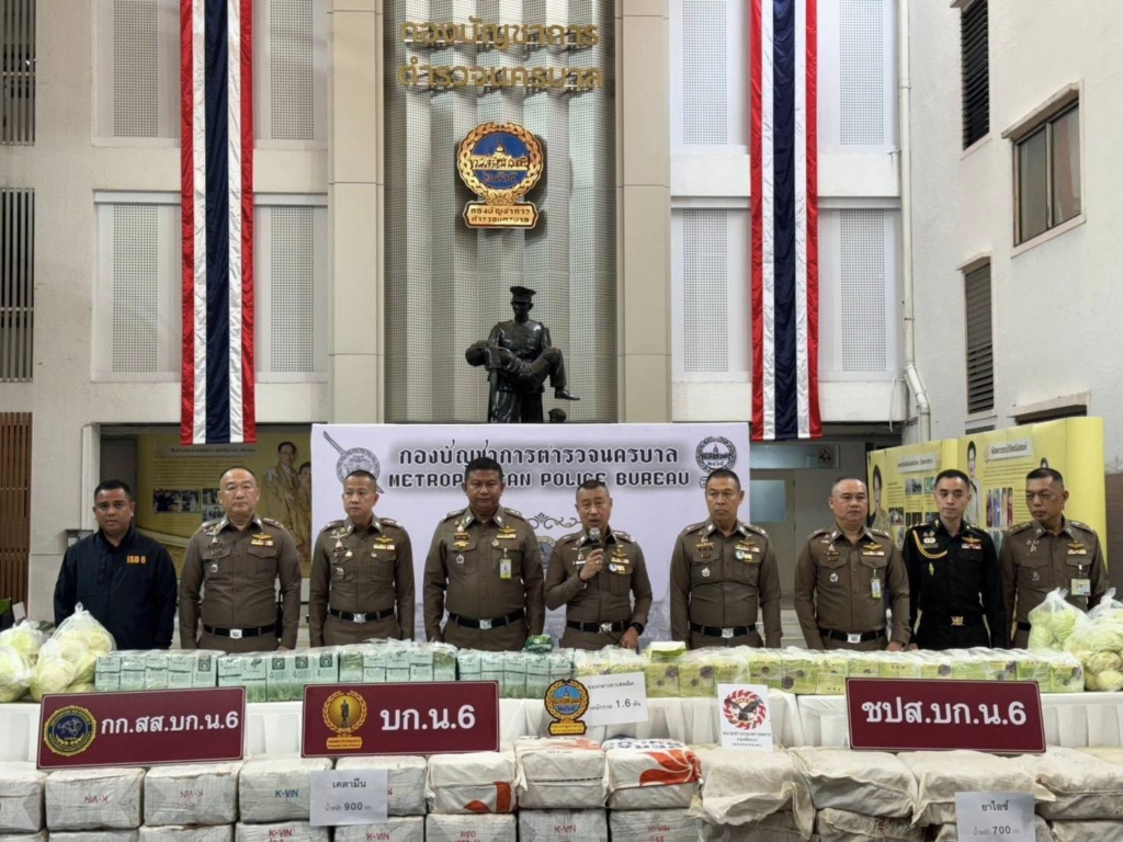 วันนี้ (6 เมษายน 2569) เวลา 11.00 น. พล.ต.อ.กิตติ์รัฐ พันธุ์เพ็ชร์ ผู้บัญชาการตำรวจแห่งชาติ (ผบ.ตร.) มอบหมายให้ พล.ต.อ.สำราญ นวลมา รอง ผบ.ตร.(ด้านความมั่นคง) ในฐานะผู้อำนวยการศูนย์อำนวยการป้องกันและปราบปรามยาเสพติด สำนักงานตำรวจแห่งชาติ (ผอ.ศอ.ปส.ตร.) เป็นประธานการแถลงผลการจับกุมคดียาเสพรายสำคัญ ของกองบังคับการตำรวจนครบาล 6 กองบัญชาการตำรวจนครบาล ณ ลานอเนกประสงค์ กองบัญชาการตำรวจนครบาล (บช.น.) โดยมีผู้เข้าร่วมแถลง ประกอบด้วย พล.ต.ท.สยาม บุญสม ผบช.น., พล.ต.ต.ธีรเดช ธรรมสุธีร์ รอง ผบช.น., พล.ต.ต.อัฏธพร วงศ์ศิริปรีดา รอง ผบช.น., พล.ต.ต.ชัยกฤต โพธิ์อ๊ะ ผบก.น.6, พ.ต.อ.นริศ ปราถนาพร รอง ผบก.น.6, พ.ต.อ.เอกรัตน์ เปาอินทร์ รอง ผบก.น.6, พ.อ.ปรเมษฐ์ ปาลกะวงศ์ ณ อยุธยา ผบ.สปข.ขกท.ศปก.ทบ., พ.ต.อ.เชิดศักดิ์ รอดเข็ม ผกก.สส.บก.น.6