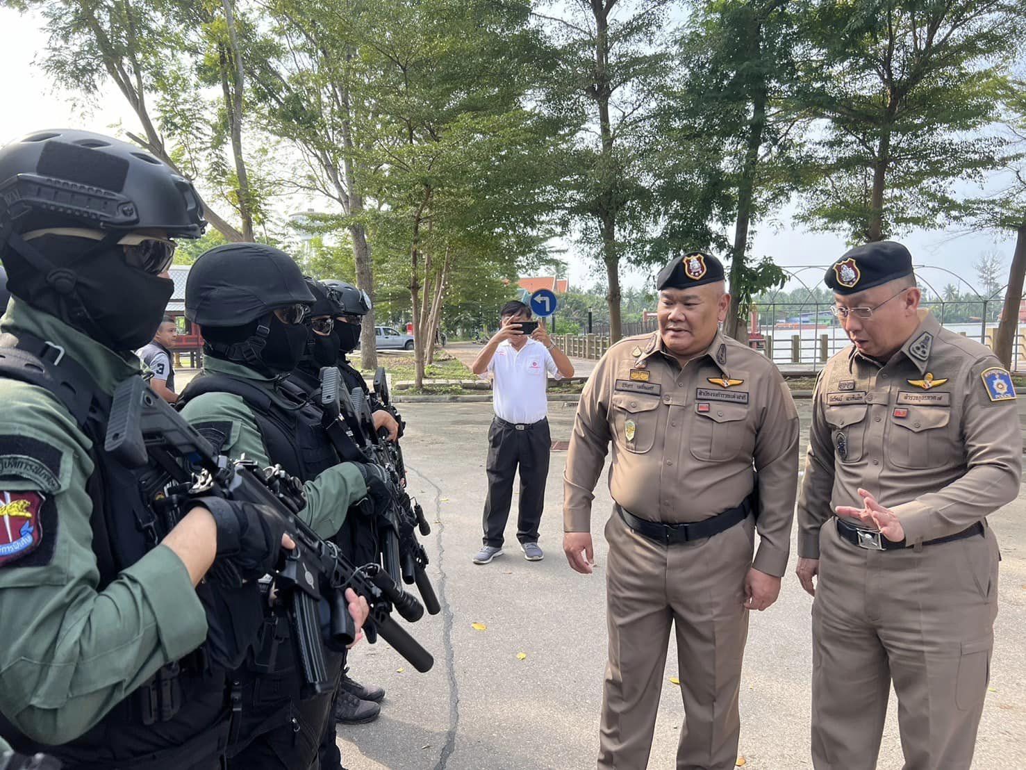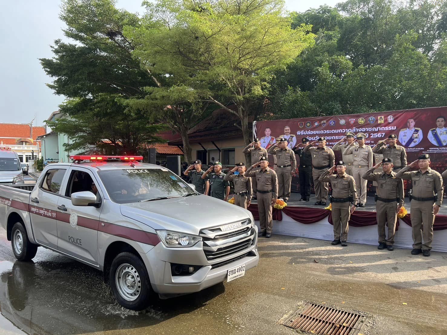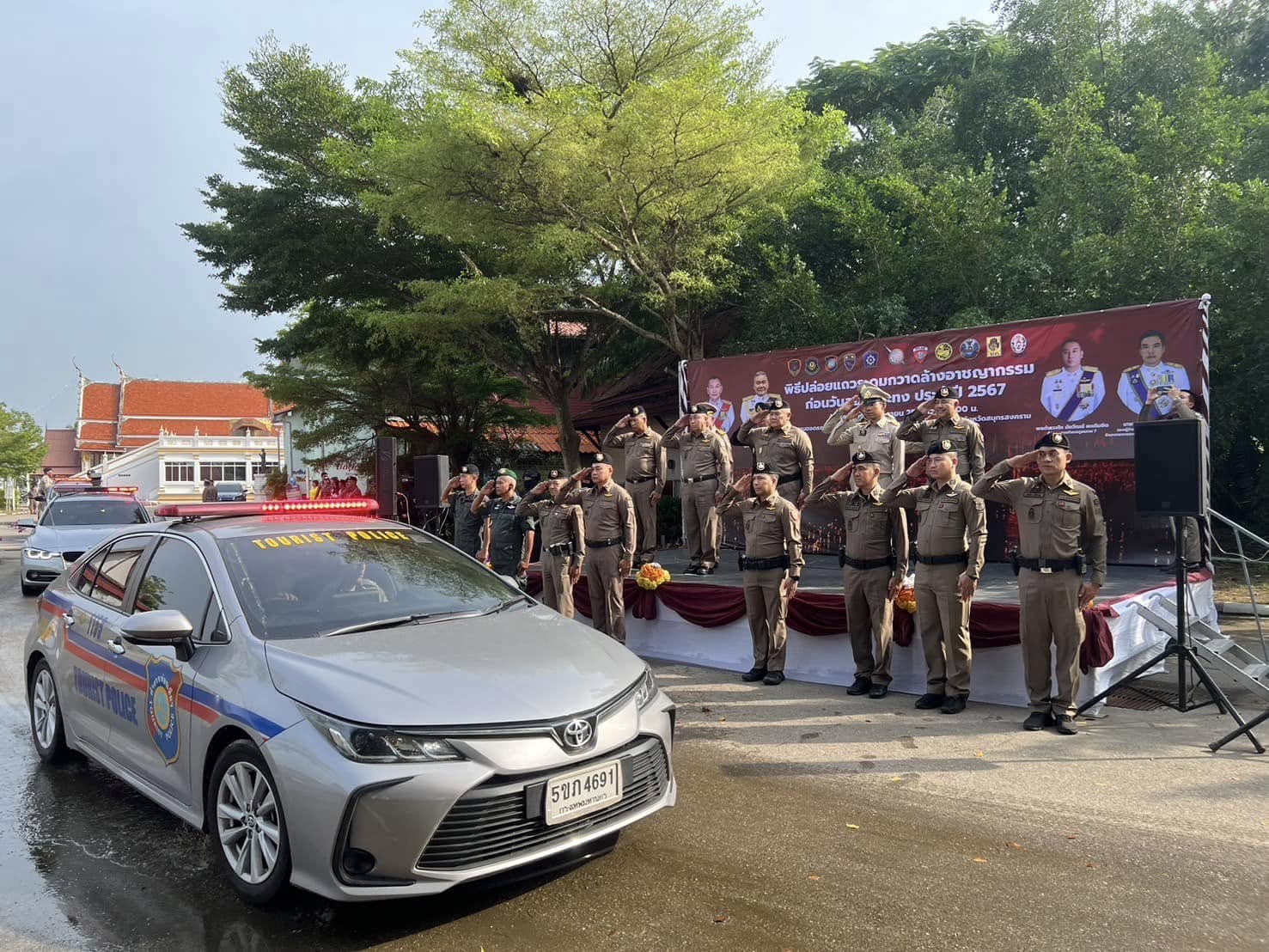 วันนี้ (8 พ.ย.67) เวลา 15.00 น. พล.ต.ท.นิรันดร เหลื่อมศรี ผู้ช่วย ผบ.ตร.(ปป 1) พร้อมด้วย พ.ต.อ.ดำรงศักดิ์ สว่างงาม รอง ผบก.ฯ ปรก.สง.ผู้ช่วย ผบ.ตร. พ.ต.อ.สมพล ใจดี รอง ผบก.ฯ ปรก.สง.ผู้ช่วย ผบ.ตร. ได้เดินทางมาเป็นประธานในพิธีปล่อยแถวระดมกวาดล้างอาชญากรรมก่อนวันลอยกระทง 2567 ของตำรวจภูธรภาค 7 พื้นที่จังหวัดสมุทรสงคราม ซึ่งเป็น 1 ใน 5 จังหวัดอัตลักษณ์พื้นถิ่น ในงานประเพณีลอยกระทง 2567 “ลอยกระทง วิถีไทย ปลอดภัย ใส่ใจสิ่งแวดล้อม” ตามนโยบายของรัฐบาล โดยมี พล.ต.ท.นัยวัฒน์ ผะเดิมชิต ผบช.ภ.7 พล.ต.ต.พิพัฒน์ ชุ่มมณีกูล รอง ผบช.ภ.7 นายกรกฏ วงษ์สุวรรณ รองผู้ว่าราชการจังหวัดสมุทรสงคราม รักษาการผู้ว่าราชการจังหวัดสมุทรสงคราม พล.ต.ต.สมภพ คูหาวิชานันท์ ผบก.ภ.จว.สมุทรสงคราม พ.ต.อ.สัณฑภวิษย์ มากช่วย รอง ผบก.ภ.จว.สมุทรสงคราม พ.ต.อ.นันทภูมิ เรืองรุ่ง รอง ผบก.ภ.จว.สมุทรสงคราม พ.ต.อ.รณกร ประคองศรี รอง ผบก.ภ.จว.สมุทรสงคราม น.อ.อชิตะสิน กำมะณี (ร.น.) รอง ศรชล.จว.สส.ศรชล.ภาค 1 พ.ท.ชาครี ศักดิ์บัณฑิตวงศ์ กอ.รมน.จังหวัดสมุทรสงคราม ปลัดจังหวัดสมุทรสงคราม เจ้าท่าภูมิภาคสาขาสมุทรสงคราม นายอำเภออัมพวา หัวหน้าสถานีในสังกัด ภ.จว.สมุทรสงคราม ผู้แทนส่วนราชการในจังหวัดสมุทรสงคราม และเจ้าหน้าที่ที่เกี่ยวข้องเข้าร่วม ณ วัดภุมรินทร์กุฎีทอง อ.อัมพวา ภ.จว.สมุทรสงคราม
