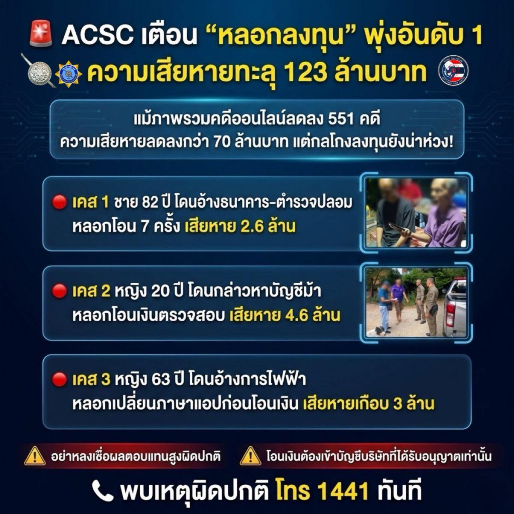 เตือนภัย! ‘หลอกลงทุน’ พุ่งอันดับ 1 สร้างความเสียหายกว่า 123 ล้านบาทในสัปดาห์เดียว! แม้ภาพรวมคดีออนไลน์จะลดลง แต่ “การหลอกลงทุน” กลับรุนแรงขึ้น ศูนย์ต่อต้านการฉ้อโกงออนไลน์