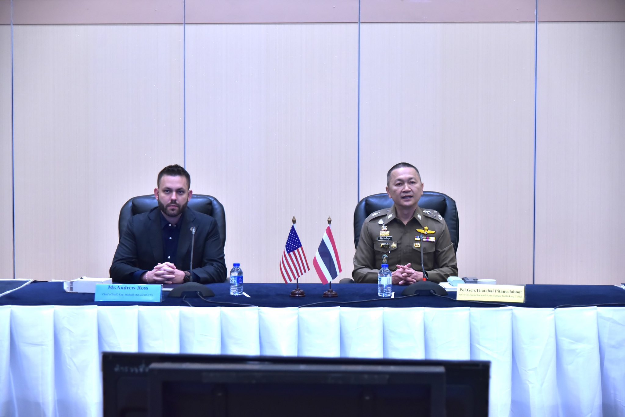 พล.ต.อ.ธัชชัย ปิตะนีละบุตร จตช./ผอ.ศตคม.ตร. ให้การต้อนรับคณะเจ้าหน้าที่รัฐสภาสหรัฐอเมริกา ที่ขอเข้าพบเพื่อหารือข้อราชการและรับฟังบรรยายผลการดำเนินการของ ศตคม.ตร. และชุดปราบปรามการล่วงละเมิดทางเพศต่อเด็กทางอินเทอร์เน็ต ณ ห้องประชุมศรียานนท์ ชั้น 2 อาคาร 1 ตร. จากนั้นได้ดูกิจการ ณ ศูนย์บริหารเหตุการณ์ แก๊งคอลเซ็นเตอร์และค้ามนุษย์นานาชาติ ชั้น 7 อาคารศูนย์ฝึกอบรมพัฒนาบุคลากรและสวัสดิการ สำนักงานตำรวจแห่งชาติ