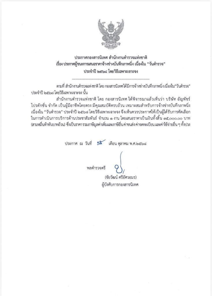 ประกาศกองสารนิเทศ สำนักงานตำรวจแห่งชาติ เรื่อง ประกาศผู้ชนะการเสนอราคาจ้างช่างบันทึกภาพนิ่ง เนื่องใน “วันตำรวจ” ประจำปี 2568 โดยวิธีเฉพาะเจาะจง