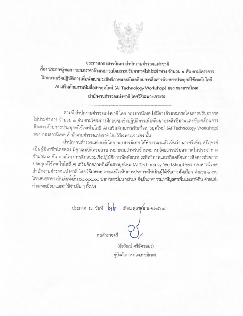 ประกาศกองสารนิเทศ สำนักงานตำรวจแห่งชาติ เรื่อง ประกาศผู้ชนะการเสนอราคาจ้างเหมารถโดยสารปรับอากาศไม่ประจำทาง จำนวน 1 คัน ตามโครงการฝึกอบรมเชิงปฏิบัติการเพื่อพัฒนาประสิทธิภาพและขับเคลื่อนการสื่อสารด้วยการประยุกต์ใช้เทคโนโลยี AI เสริมศักยภาพทีมสื่อสารยุคใหม่ (AI Technology Workshop) ของ กองสารนิเทศ สำนักงานตำรวจแห่งชาติ โดยวิธีเฉพาะเจาะจง