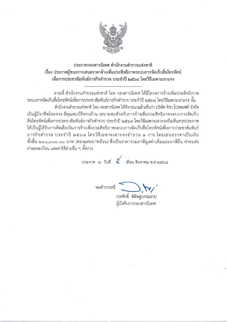 ประกาศกองสารนิเทศ สำนักงานตำรวจแห่งชาติ เรื่อง ประกาศผู้ชนะการเสนอราคาจ้างเพิ่มประสิทธิภาพระบบการจัดเก็บสื่อโทรทัศน์ เพื่อการประชาสัมพันธ์ภารกิจตำรวจ ประจำปี 2568 โดยวิธีเฉพาะเจาะจงadmin05/08/2568จัดซื้อจัดจ้าง
