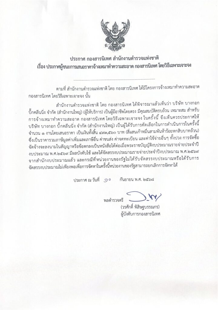 ประกาศ กองสารนิเทศ สำนักงานตำรวจแห่งชาติ เรื่อง ประกาศผู้ชนะการเสนอราคาจ้างเหมาทำความสะอาด กองสารนิเทศ โดยวิธีเฉพาะเจาะจงadmin10/09/2568จัดซื้อจัดจ้าง