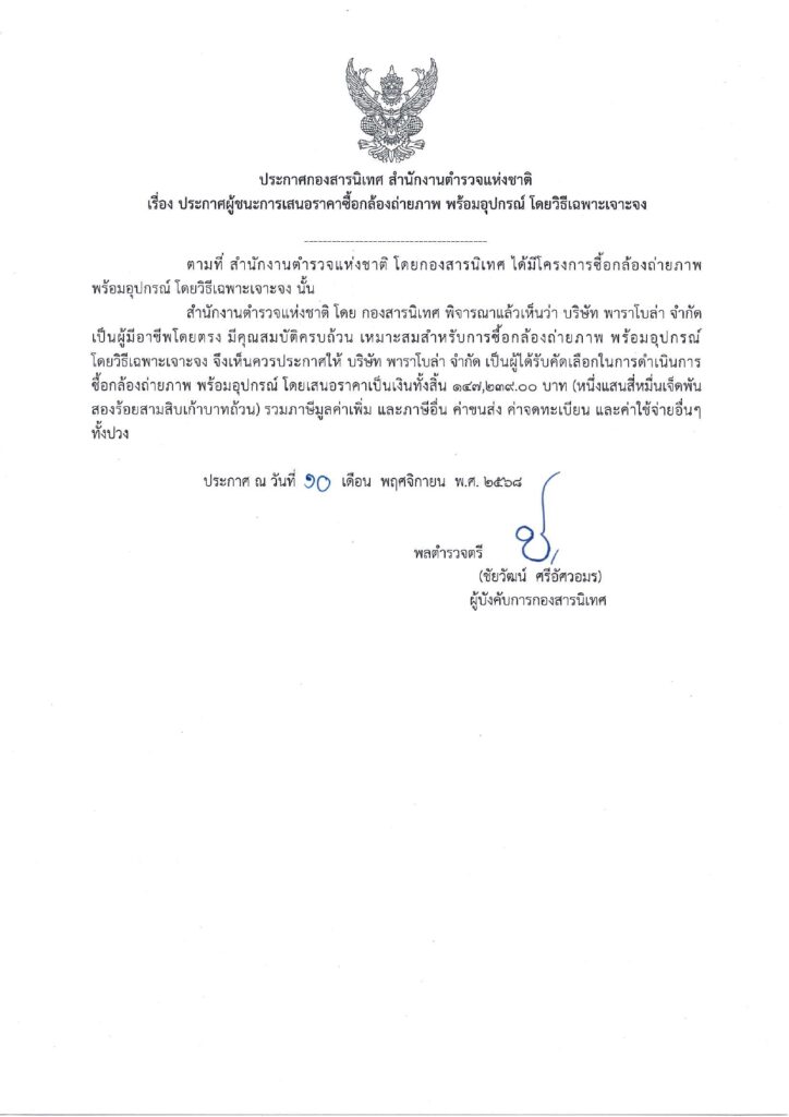 ประกาศกองสารนิเทศ สำนักงานตำรวจแห่งชาติเรื่อง ประกาศผู้ชนะการเสนอราคาซื้อกล้องถ่ายภาพ พร้อมอุปกรณ์ โดยวิธีเฉพาะเจาะจง