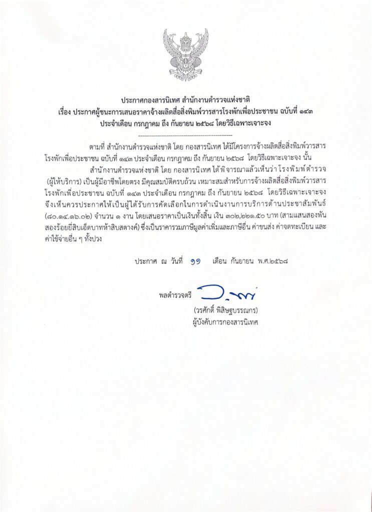 ประกาศกองสารนิเทศ สำนักงานตำรวจแห่งชาติ เรื่อง ประกาศผู้ชนะการเสนอราคาจ้างผลิตสื่อสิ่งพิมพ์วารสารโรงพักเพื่อประชาชน ฉบับที่ 143ประจำเดือน กรกฎาคม ถึง กันยายน ๒๕68 โดยวิธีเฉพาะเจาะจงadmin11/09/2568จัดซื้อจัดจ้าง
