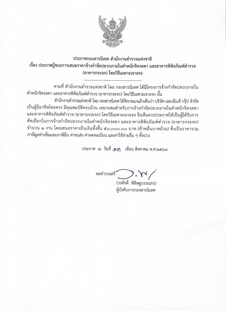 ระกาศกองสารนิเทศ สำนักงานตำรวจแห่งชาติ เรื่อง ประกาศผู้ชนะการเสนอราคาจ้างกำจัดปลวกภายในตำหนักจิตรลดา และอาคารพิพิธภัณฑ์ตำรวจ (อาคารกระจก) โดยวิธีเฉพาะเจาะจงadmin13/08/2568จัดซื้อจัดจ้าง