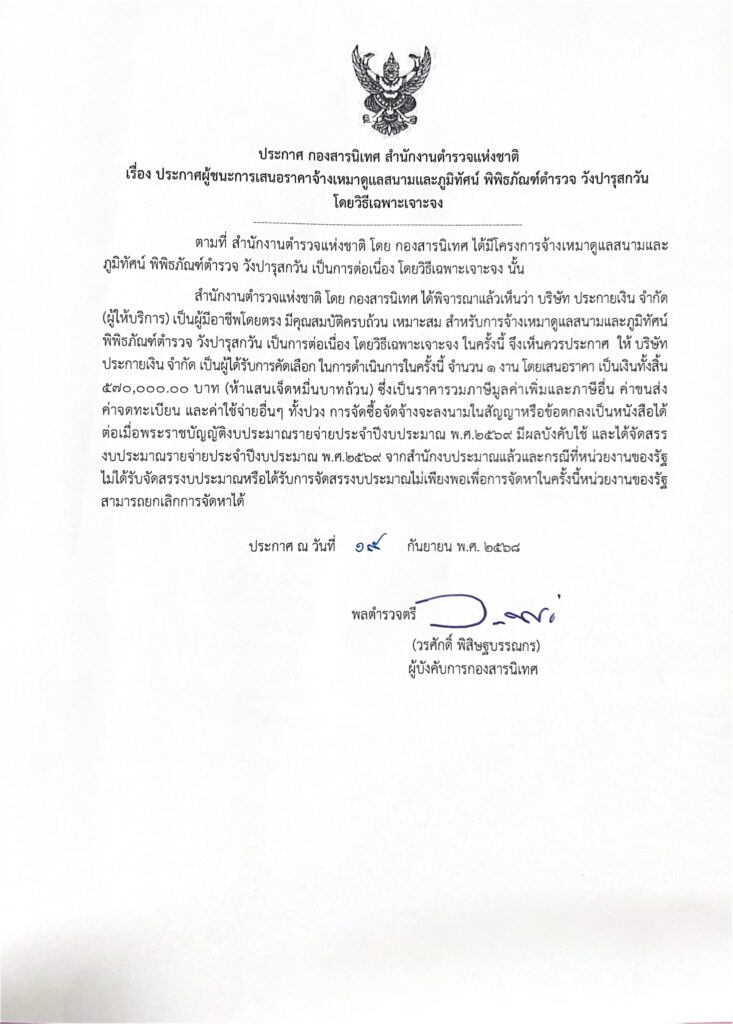 ประกาศ กองสารนิเทศ สำนักงานตำรวจแห่งชาติ เรื่อง ประกาศผู้ชนะการเสนอราคาจ้างเหมาดูแลสนามและภูมิทัศน์ พิพิธภัณฑ์ตำรวจ วังปารุสกวัน โดยวิธีเฉพาะเจาะจงadmin19/09/2568จัดซื้อจัดจ้าง