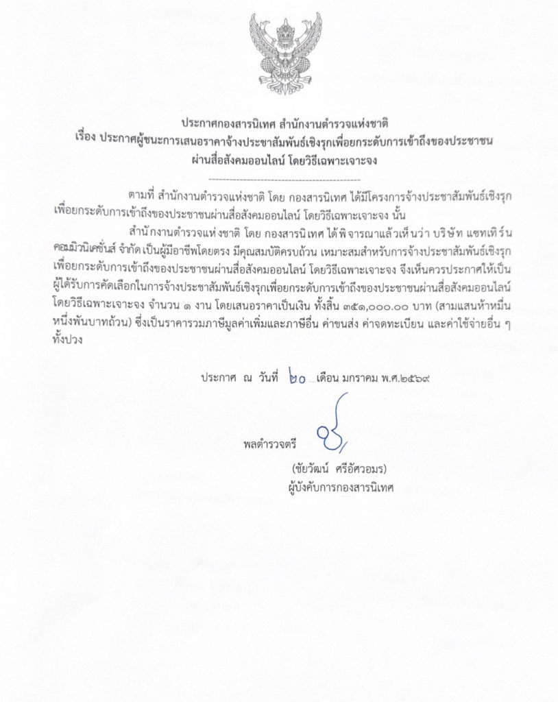 ประกาศกองสารนิเทศ สำนักงานตำรวจแห่งชาติเรื่อง ประกาศผู้ชนะการเสนอราคาจ้างประชาสัมพันธ์เชิงรุกเพื่อยกระดับการเข้าถึงของประชาชนผ่านสื่อสังคมออนไลน์ โดยวิธีเฉพาะเจาะจง