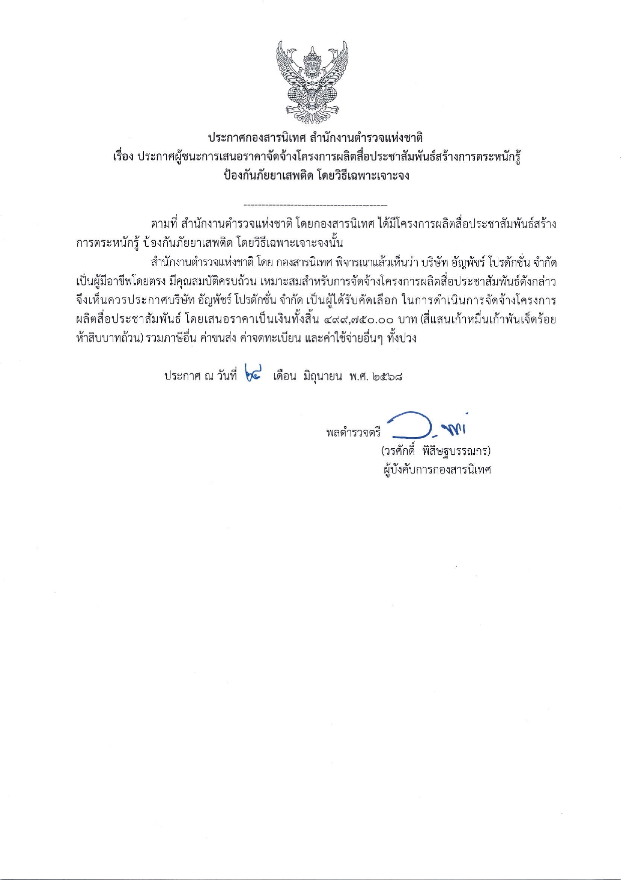 ประกาศกองสารนิเทศ สำนักงานตำรวจแห่งชาติ เรื่อง ประกาศผู้ชนะการเสนอราคาจัดจ้างโครงการผลิตสื่อประชาสัมพันธ์สร้างการตระหนักรู้ ป้องกันภัยยาเสพติด โดยวิธีเฉพาะเจาะจงadmin24/06/2568จัดซื้อจัดจ้าง