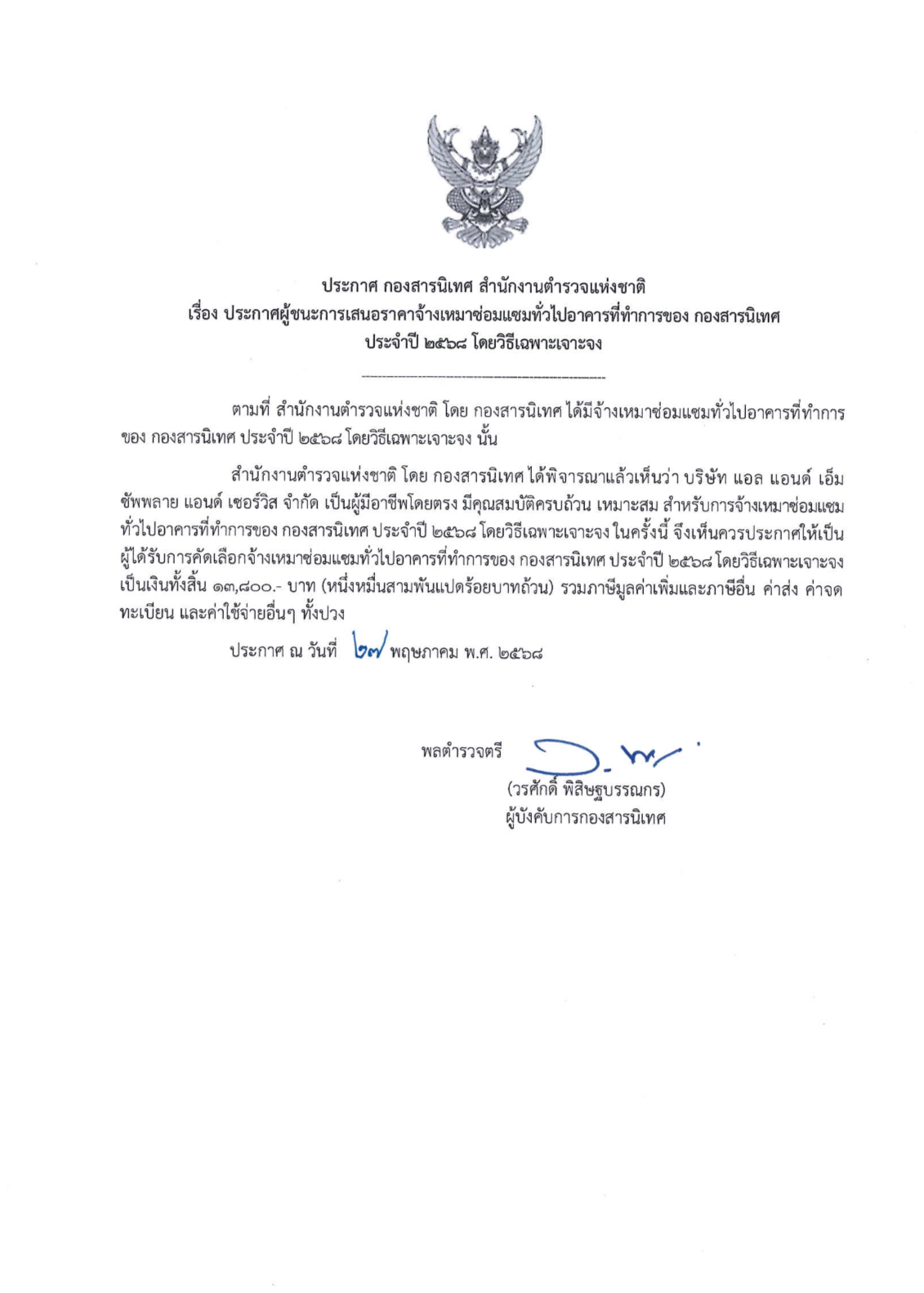 ประกาศ กองสารนิเทศ สำนักงานตำรวจแห่งชาติ เรื่อง ประกาศผู้ชนะการเสนอราคาจ้างเหมาซ่อมแซมทั่วไปอาคารที่ทำการของ กองสารนิเทศ ประจำปี 2568 โดยวิธีเฉพาะเจาะจงadmin27/05/2568จัดซื้อจัดจ้าง