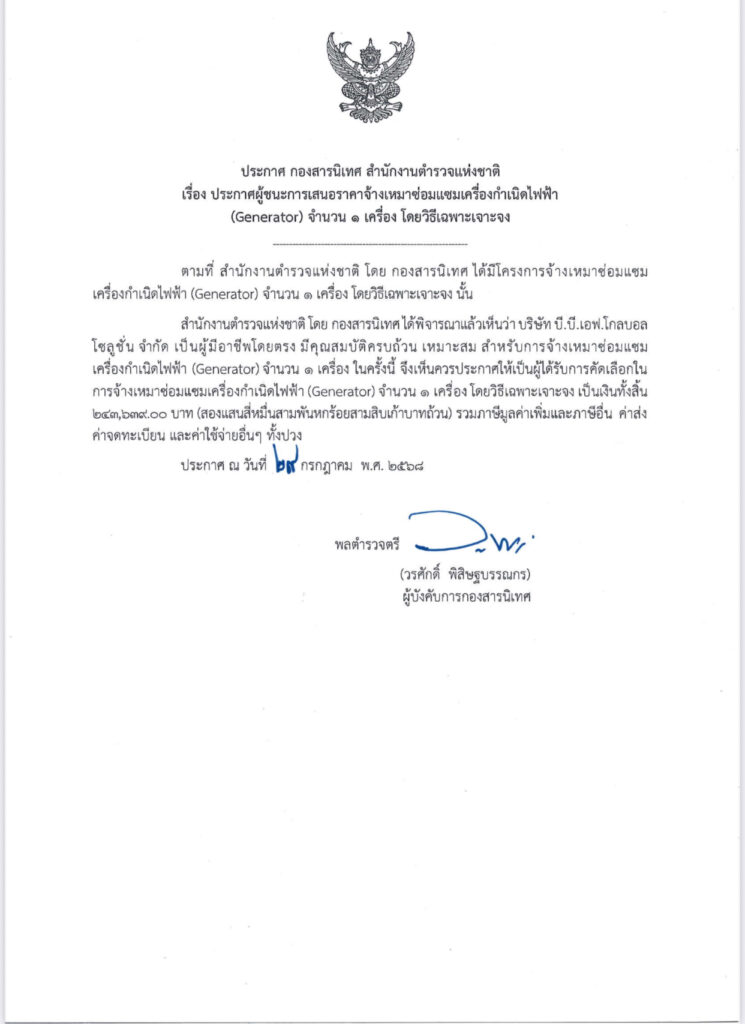 ประกาศ กองสารนิเทศ สำนักงานตำรวจแห่งชาติ เรื่อง ประกาศผู้ชนะการเสนอราคาจ้างเหมาซ่อมแซมเครื่องกำเนิดไฟฟ้า (Generator) จำนวน 1 เครื่อง โดยวิธีเฉพาะเจาะจงadmin30/07/2568จัดซื้อจัดจ้าง