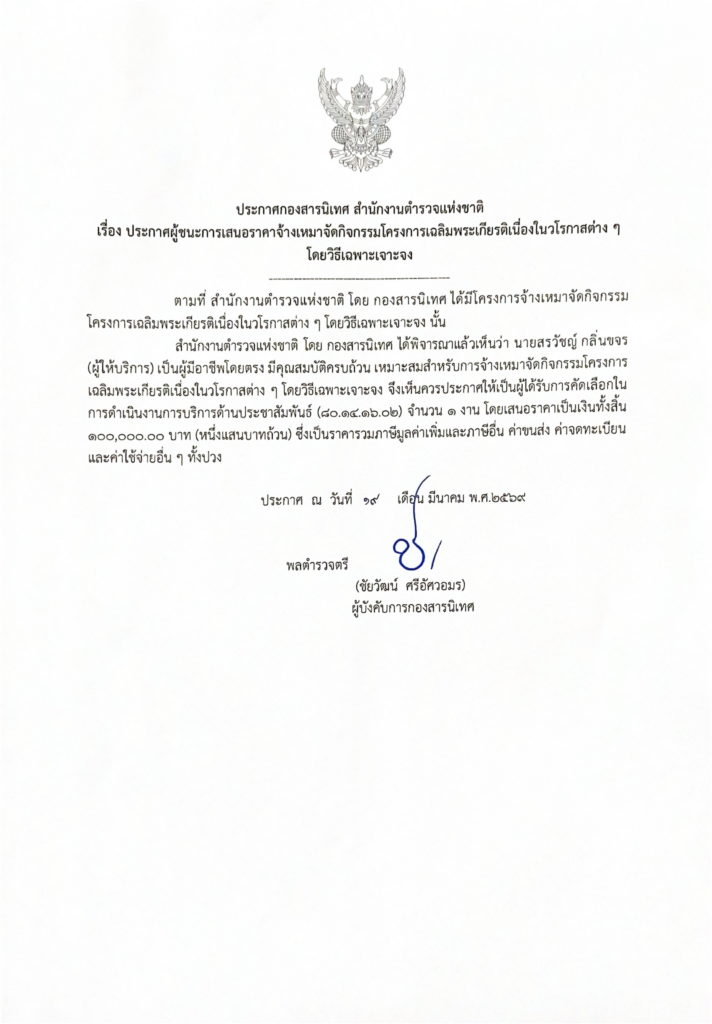 ประกาศกองสารนิเทศ สำนักงานตำรวจแห่งชาติเรื่อง ประกาศผู้ชนะการเสนอราคาจ้างเหมาจัดกิจกรรมโครงการเฉลิมพระเกียรติเนื่องในวโรกาสต่างๆ โดยวิธีเฉพาะเจาะจงadmin19/03/2569จัดซื้อจัดจ้าง